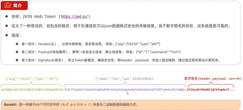 token是令牌的意思,java对Jason数据进行编码(使用Base64进行编码),因为Base64可以编码,也可以解码,所以在payload部分不能存放密码信息